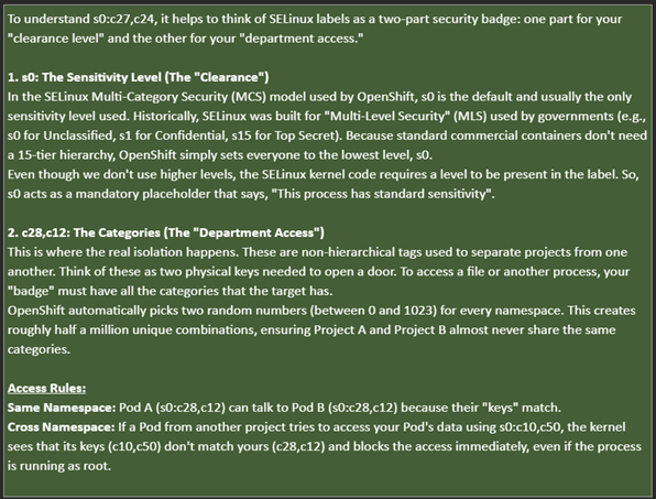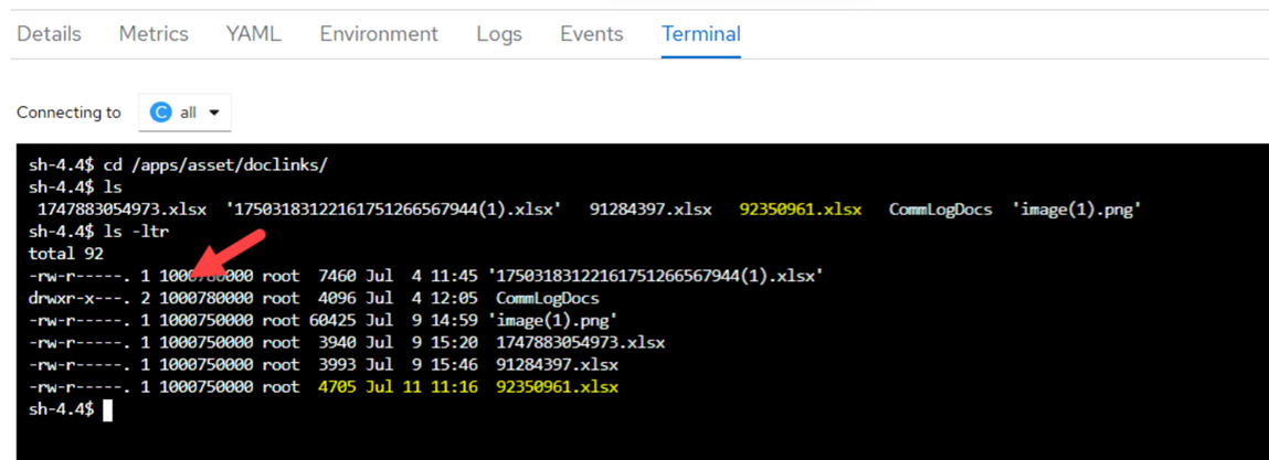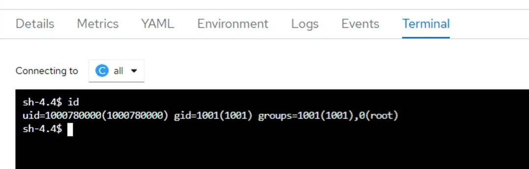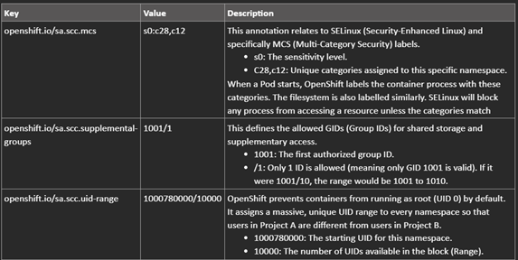 In summary, once these changes are applied to the OpenShift namespace, all pods deployed within it will inherit and run with the configured GID (e.g., 1001), ensuring consistent security context enforcement across workloads.
