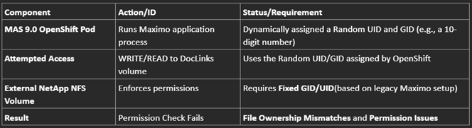 Because the containerized Maximo workloads use a random, dynamically assigned UID to access the volume, while the volume expects a fixed UID (specifically 1000), we encounter file ownership mismatches and permission issues when attempting actions like file uploads.