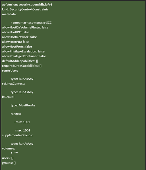 Next, we must bind this custom SCC (mas-test-manage-securitycontext) to the service account responsible for creating the Maximo pods (e.g., ibm-mas-manage-manage-deployment):