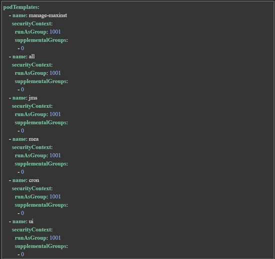 The securityContext must enforce runAsGroup: 1001 across all relevant Maximo workloads. This fixed GID must be applied to the following workload templates defined in the CRD: